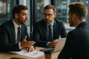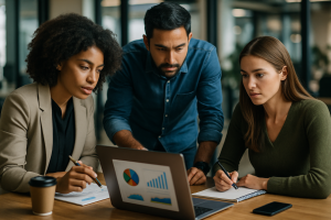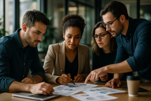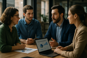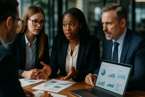 Profissionais de negócios discutindo gráficos e dados em uma sala moderna